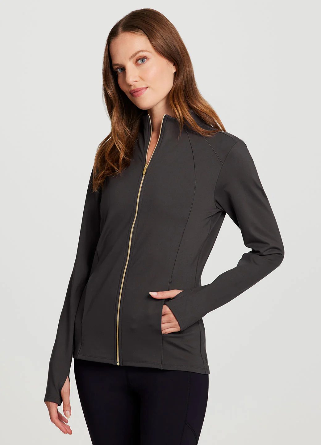 Boasting functional features like thumbholes on each sleeve plus side pockets so you can conveniently carry your phone, keys and other essentials, our Sunday Stroll Jacket is an everyday active jacket you can take from studio to street. Ultra soft, stretchy interlock jersey fabric is lightweight and perfect for workouts, travel days or dog walks, while a full zip design and mock neckline provide added coverage. A regular length combines with an athletic body skimming fit and flattering vertical seaming detail throughout for a transitional jacket you can layer and wear anywhere.